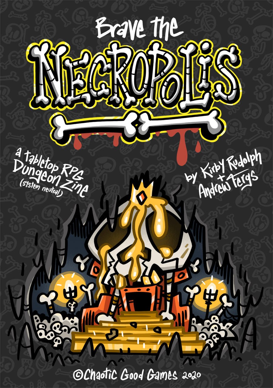 Brave the Necropolis is a short and brutal dungeon you can explore with any tabletop roleplaying experience. It's great for GMs who know what they're doing or couldn't care less about following the rules. The encounters are quick and raw: Kirby's wild graffiti-inspired monsters and Andrew's crisp Kirby-inspired maps, peppered sparingly with overdramatic flavour text.